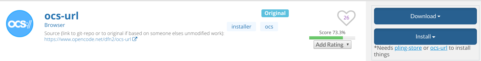 https://www.pling.com/p/1136805/ 中,下载 ocs-url,下载时选择 deb 后缀的安装包。